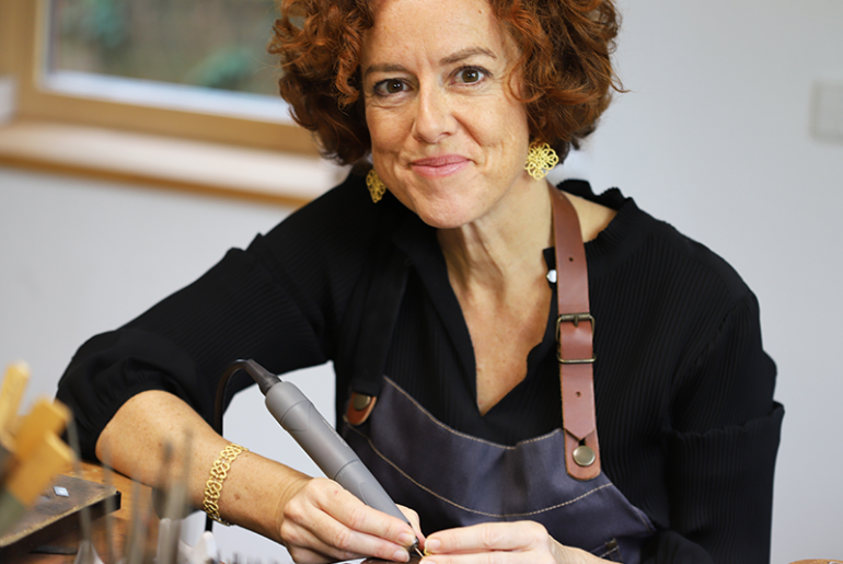 Ob Ohr- oder Armschmuck, Ringe, Halsketten oder Haarschmuck, wobei letzterer besonders bei Bräuten sehr beliebt ist: jedes Schmuckstück von Brigitte Adolph trägt ihre unverkennbare Handschrift. Über ihre Liebe zu Schmuck und Handarbeit sagt die gelernte Goldschmiedin und studierte Schmuckdesignerin aus Karlsruhe: „Handwerkskunst ist mein Leben, meine Leidenschaft, Wenn ich mit meinen Händen arbeite, komme ich in einen Flow-Zustand. Ich bin glücklich, wenn ich etwas erschaffen kann, das eigentlich nur in meinem Kopf, meiner Phantasie existiert und das ich dann tatsächlich in den Händen halten kann.“