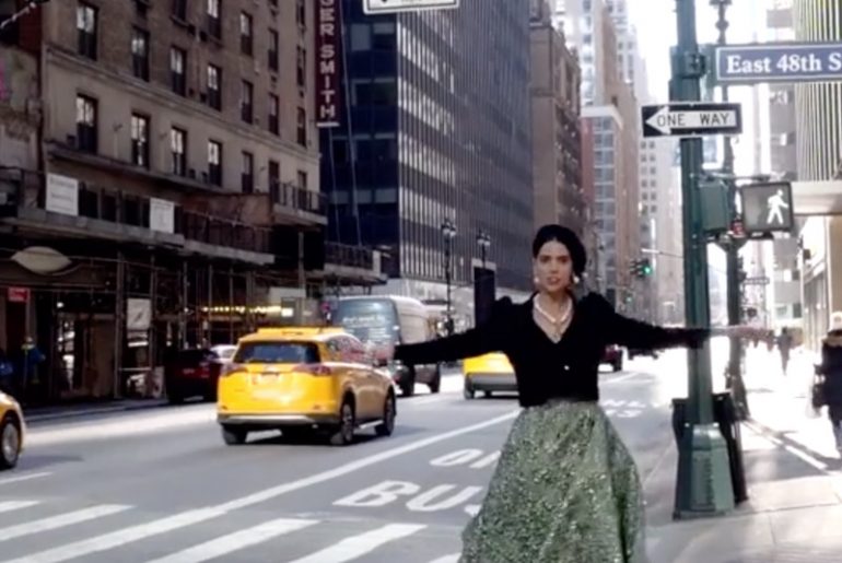 Untermalt von dem melodischen Song „Strangers in Disguise“ von Anthony Lazaro flaniert Zoe Helali anmutig wie eine Tangotänzerin in einem schwingenden Tellerrock von Modedesigner Guido Maria Kretschmer durch die Straßen Manhattans, wirbelt ein Mal um ihre eigene Achse, um anschließend in einem typischen New Yorker Yellow Cab zu entschwinden.
