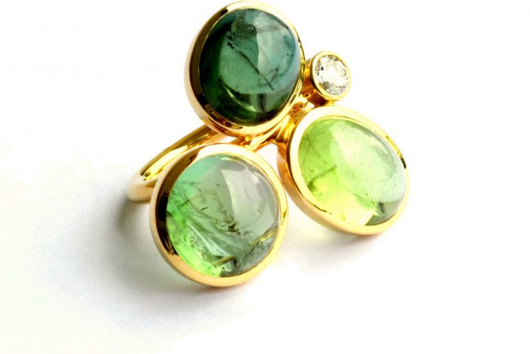 Unikatringe „Viola“, jeweils mit drei besonderen Cabochons und Brillanten. Erhältlich in Gelbgold, Rotgold und Platin, ab ca. 9200 Euro.