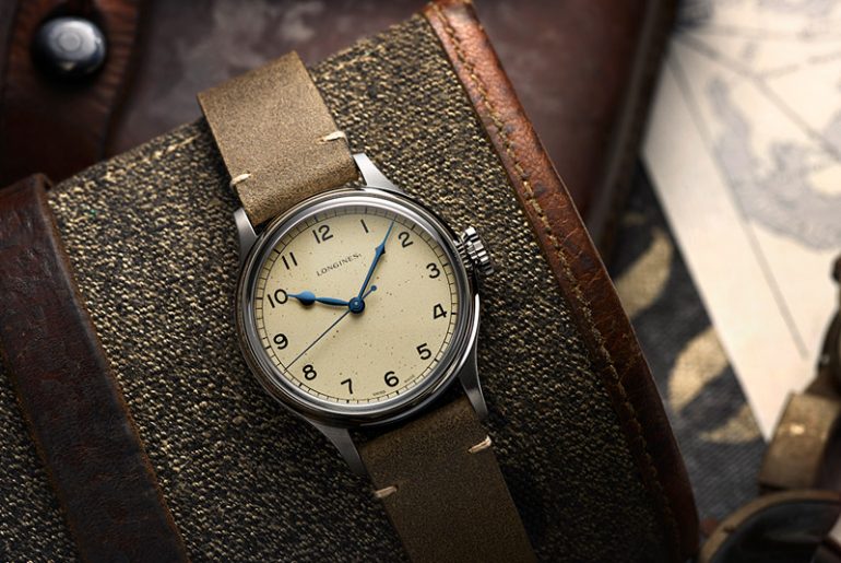 Größer als ihre ältere Schwester ist auch die„Heritage Military“: mit einem Durchmesser von 38,5 Millimeter sogar ganze sechs Millimeter. Das Originalmodell wurde in den 1940er Jahren für die Königlichen Streitkräfte der britischen Armee entworfen und besticht noch heute mit ihrer schlichten, klaren Optik – weshalb Longines den Look der Uhr (abgesehen von dem bereits erwähnten zeitgemäßen Durchmesser) grundsätzlich nicht verändert hat. Selbst auf den Hinweis „Automatic“, der auf dem Zifferblatt jeder Uhr der aktuellen Kollektion zu finden ist, verzichtet Longines. Darüber hinaus werden auf dem silberfarbenen Opalin-Zifferblatt sogar die Spuren der Oxidation wiedergegeben: Die Oberfläche der Zifferblätter wird dafür mithilfe eines einmaligen Verfahrens von Hand mit winzigen Tröpfchen schwarzer Farbe verziert. So ist jedes Exemplar ein Unikat! Zu jeder Uhr gehört zudem nicht nur ein khakifarbenes Lederband, sondern auch ein gleichfarbiges NATO-Band. Um die beiden Bänder dann auch entspannt selbst zu Hause wechseln zu können, wird jedes Exemplar mit dem dazugehörigen Werkzeug in einer hübschen Box geliefert.