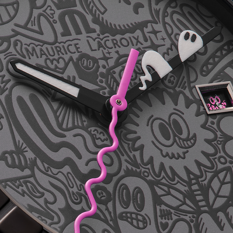 Weitere optische Highlights sind der mit einem kleinen Geist und mit Leuchtbeschichtung verzierte Minutenzeiger sowie der geschwungene rosafarbene Sekundenzeiger, die sich beide perfekt von dem anthrazitfarbenem Zifferblatt abheben.