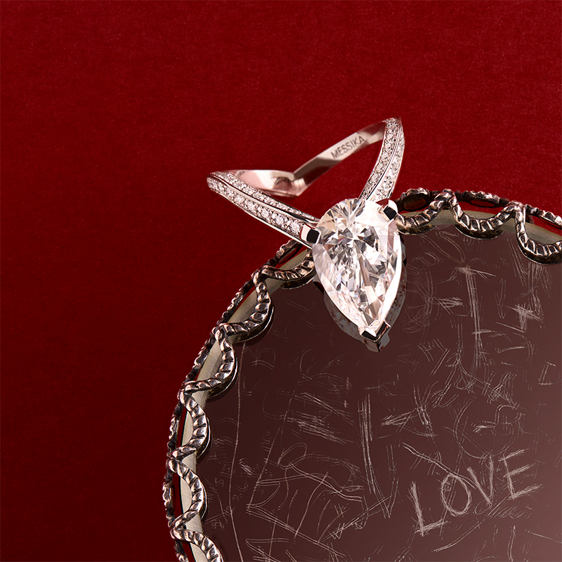 Diese intime Verbindung zum Diamanten führt bis in die Gegenwart: Als moderne Hommage ritzte Modellegende Kate Moss einst mit einem Diamantring die Worte „It’s 2 late 2 go 2 bed“ in einen Spiegel des Hauses. Ein flüchtiger Moment des Übermuts und doch ein bleibendes Zeichen ungezähmter Leidenschaft. Eben hier setzt die Zusammenarbeit mit Messika an.