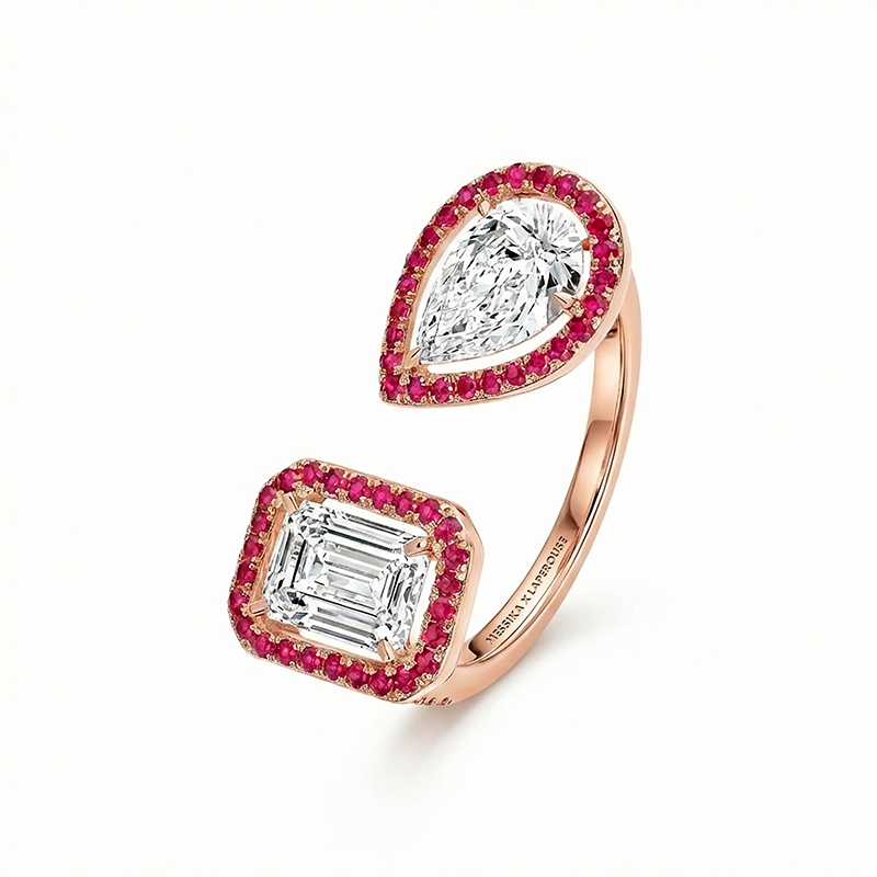 Für Lapérouse interpretiert Messika-Gründerin und Kreativdirektorin Valérie Messika ihr ikonisches „My Twin Toi & Moi“-Design neu. Der Ring aus warmem Roségold vereint zwei Diamanten von insgesamt 0,60 Karat: einen im Birnenschliff, einen im Smaragdschliff. Gegensätzlich und doch perfekt ausbalanciert, stehen sie einander gegenüber und sind eine zeitgenössische Liebeserklärung an das klassische „Toi & Moi“. Umgeben von einem feinen Rubin-Halo entsteht eine lebendige Spannung, die die Intensität von Nähe, Begehren und Versprechen widerspiegelt. Ausgezeichnet mit der speziellen Gravur „Messika x Lapérouse“ wird die Special Edition zu einem besonderen Sammlerstück, das Geschichte und Gegenwart miteinander verbindet.