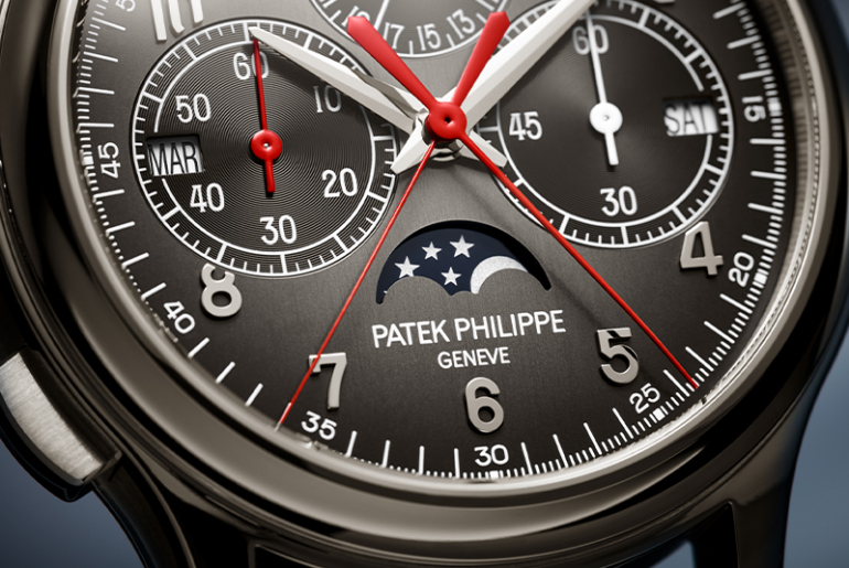Der Schleppzeiger-Monopusher-Chronograph 5373P mit ewigem Kalender ist der erste Linkshänder-Chronograph in der jüngeren Geschichte von Patek Philippe. Inspiriert ist der Neuzugang mit dem 38,3 Millimeter großen Platingehäuse von der Referenz 5372. Auf dem anthrazitfarbenem Zifferblatt, gefertigt aus 18 Karat Gold und mit Goldzifffern versehen, heben sich die Stunden- und Minutenzeiger aus Weißgold sowie der rot lackierten Stoppzeiger perfekt ab. Die roten Kontrastnähte des schwarzen Kalbslederarmbands mit geprägtem Textilmotiv setzen dazu passende Farbakzente. Im Inneren des Linkshänder-Chronographen arbeitet das Kaliber CHR 27-525 PS Q mit Handaufzug, dabei handelt es sich um das flachste je gebaute Uhrwerk dieser Art.