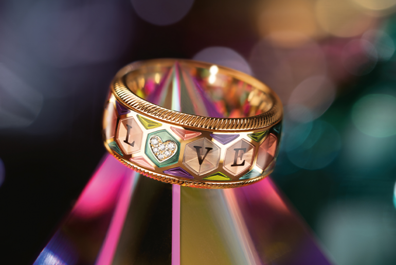 Der Jahresring 2026 fasziniert durch ein intensives Farbspiel, das die leidenschaftlichen Facetten wahrer Liebe widerspiegelt: von tiefem Petrol bis hin zu sattem Violett. Jede Nuance erzählt von Intensität, Hingabe und Stärke und lässt die Liebe so im wahrsten Sinne des Wortes in magischen Kaltemaille-Farben leuchten.
