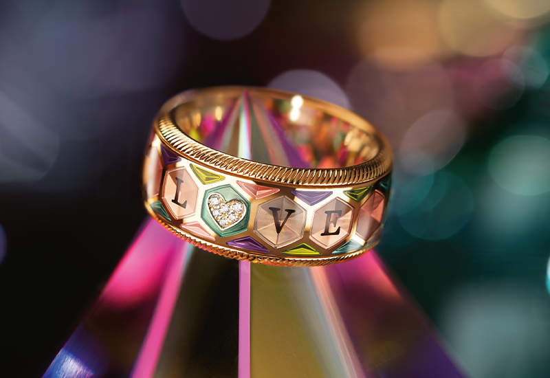 Mit dem Jahresring „Aus Liebe“ für das Jahr 2026 präsentiert Wellendorff ein streng limitiertes Sammlerstück, das mit kraftvollen Farben und einem kunstvollen Wabenmuster fasziniert. Jede Facette, jede Gravur, jedes kostbare Detail feiert die Liebe und damit jene Kraft, die seit über 130 Jahren das Herz der Manufaktur beflügelt.