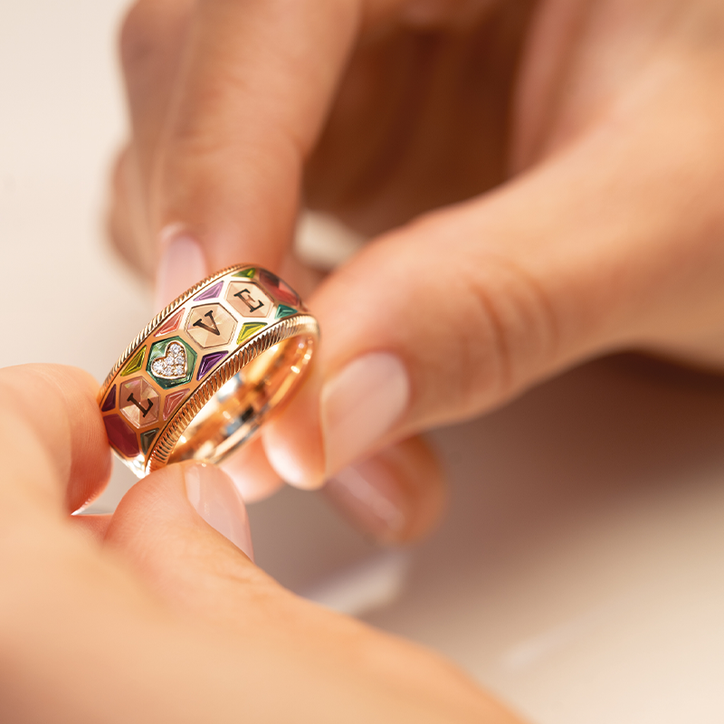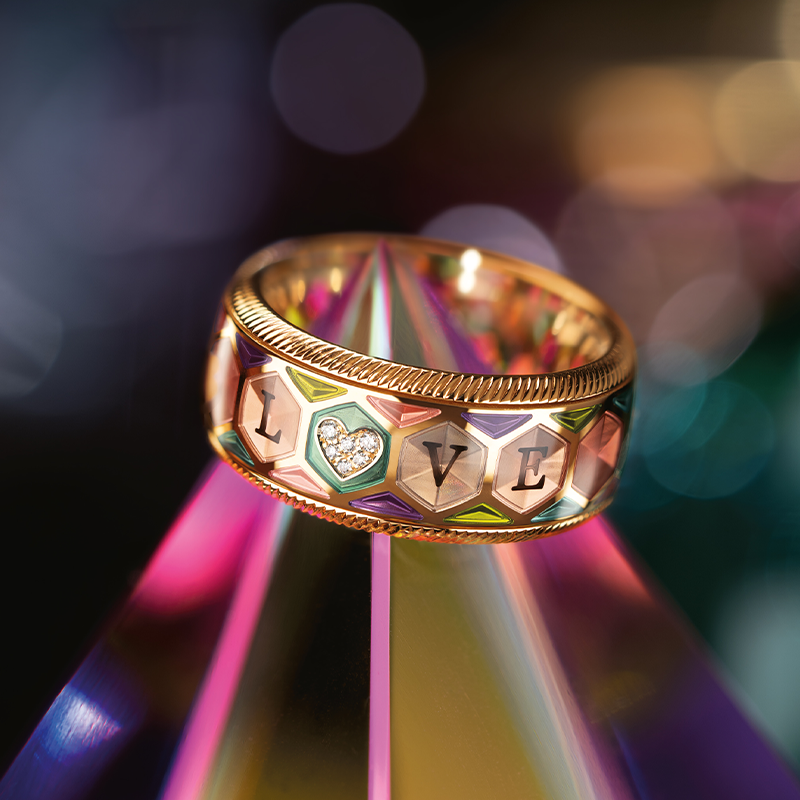Mit dem Jahresring „Aus Liebe“ für das Jahr 2026 präsentiert Wellendorff ein streng limitiertes Sammlerstück, das mit kraftvollen Farben und einem kunstvollen Wabenmuster fasziniert. Jede Facette, jede Gravur, jedes kostbare Detail feiert die Liebe und damit jene Kraft, die seit über 130 Jahren das Herz der Manufaktur beflügelt.