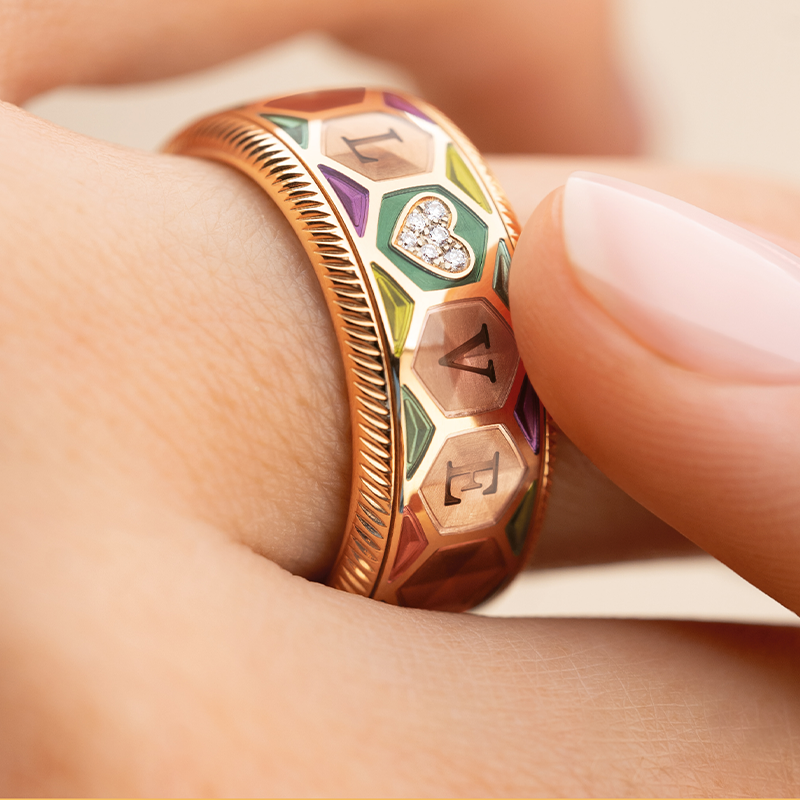 Der Jahresring 2026 fasziniert durch ein intensives Farbspiel, das die leidenschaftlichen Facetten wahrer Liebe widerspiegelt: von tiefem Petrol bis hin zu sattem Violett. Jede Nuance erzählt von Intensität, Hingabe und Stärke und lässt die Liebe so im wahrsten Sinne des Wortes in magischen Kaltemaille-Farben leuchten.