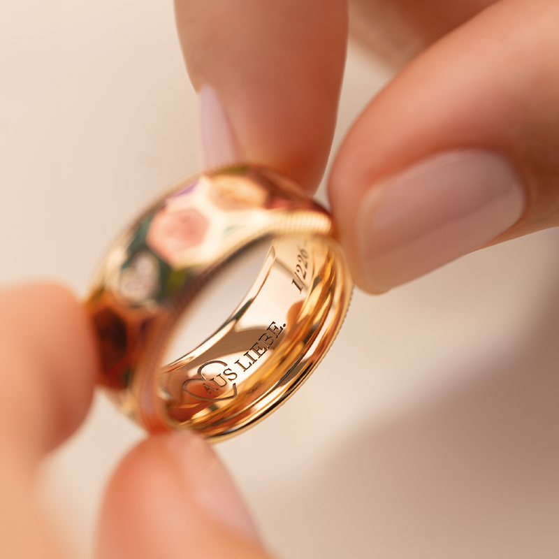 Denn ebenso wie die Liebe selbst keinen Anfang und kein Ende hat, so dreht sich auch der Jahresring „Aus Liebe“ spielerisch und endlos um seine eigene Achse. Die sanfte Drehbarkeit, eine ikonische Wellendorff-Erfindung, verleiht dem aus 18-karätigem Gold gefertigten Ring mit den markanten Kordelrändern dabei jene besondere Leichtigkeit, die seit Jahrzehnten das Herz vieler Schmuckliebhaberinnen höherschlagen lässt.