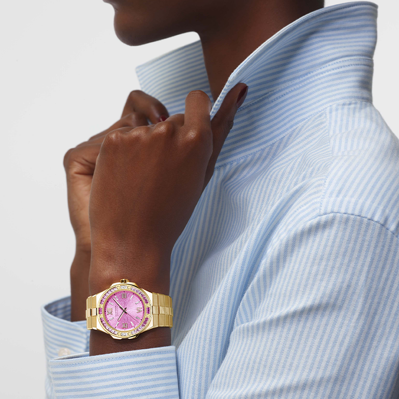 Im Mittelpunkt steht das Zifferblatt in der faszinierenden Farbe „Rock Jasmine“. Das Pink der Uhr ist eine Referenz an den Alpen-Mannsschild (Androsace alpina), eine filigrane Blume, die ausschließlich in hochgelegenen, kargen Felslandschaften wächst. Ihre Widerstandskraft und Schönheit spiegeln sich in der ästhetischen Kraft dieser Uhr wider. Die fein auf Messing geprägte, irisierende Struktur verleiht dem Zifferblatt Tiefe und Lebendigkeit und bietet ein Spiel aus Licht und Farbe, das bei jeder Bewegung neue Nuancen offenbart.