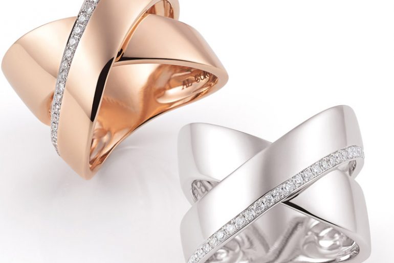 In opulenten Bahnen kreisen zwei breite Goldbahnen um den Finger, kreuzen ihren Weg und verschlingen sich für die Ewigkeit. Vollendet wird das schöne Design durch ein schmales Band aus funkelnden weißen Brillanten, was den Ringen eine besonders kostbare und raffinierte Note verleiht.