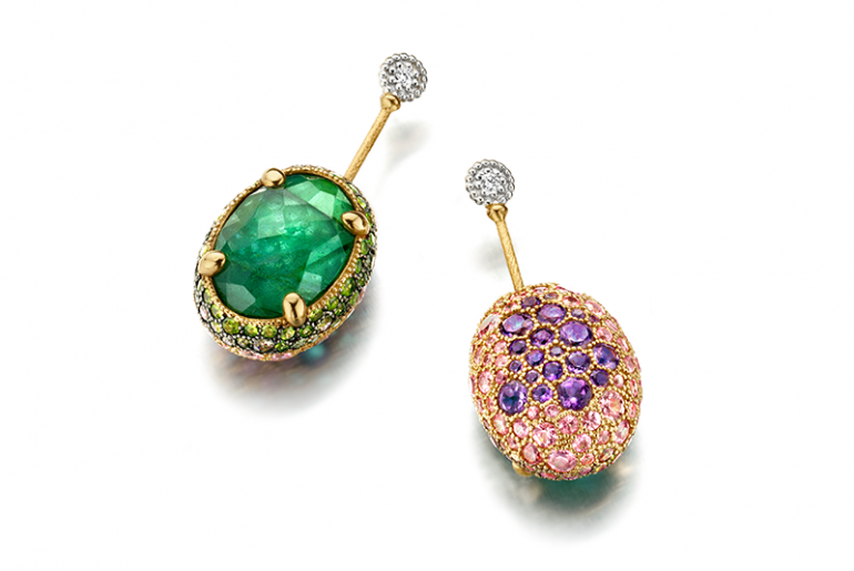 Nanis: Wendeohrringe „Reverse“ aus der Kollektion „Dancing in the Rain“, gefertigt aus 18 Karat Gelbgold mit Tsavorit, rosa Saphiren und Amethyst, ca. 8210 Euro.