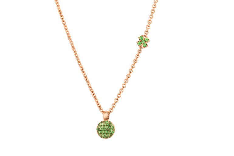 „Joy“-Kette mit „Küsschen“ (X), vorne mit Tsavoriten, hinten mit blauen Diamanten gefasst, ca. 2100 Euro; „Stardust“-Anhänger mit Tsavoriten, ca. 1300 Euro.