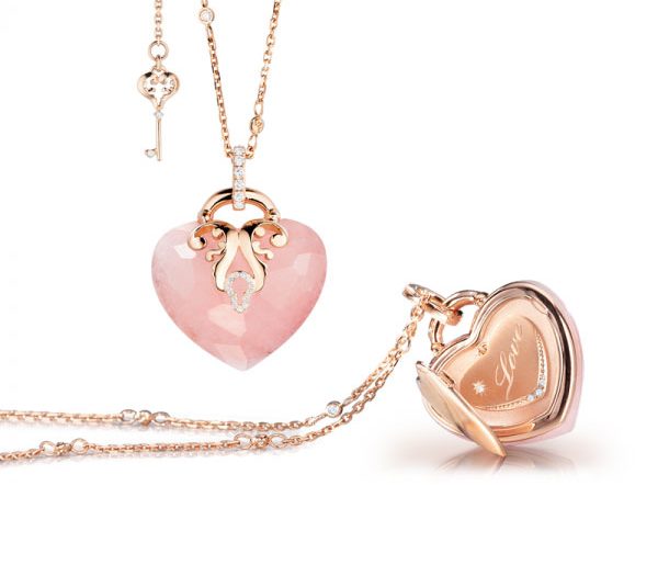 Collier „Love Message“ aus der Jewelled Life/The Colour Collection, gefertigt aus 750 Roségold, einem facettierten Rosenquarz und 52 Diamanten im Brillant-Schliff (0.42ct TW/vs1), ca. 6900 Euro.