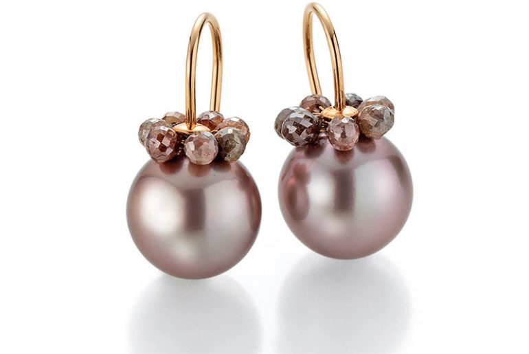 Gellner Ohrschmuck aus der „Rendezvous“ Kollektion aus 750 Roségold mit braunen Tahiti-Zuchtperlen (11 bis 12 mm) und braunen Diamant-Briolettes, ca. 1995 Euro.