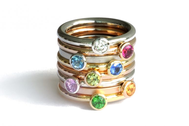„Floh“-Ringe in 750 Gelbgold, 750 Rotgold oder 950 Platin mit Farbsteinen und Brillanten, ab ca. 1150 Euro.