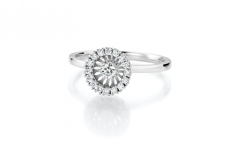 Swing heißt der traumhafte Ring von der Manufaktur Jörg Heinz. Der schwungvolle Name ist dabei durchaus Programm, denn im Zentrum des Swing-Rings vollführt ein beweglicher Diamant einen magischen Tanz.