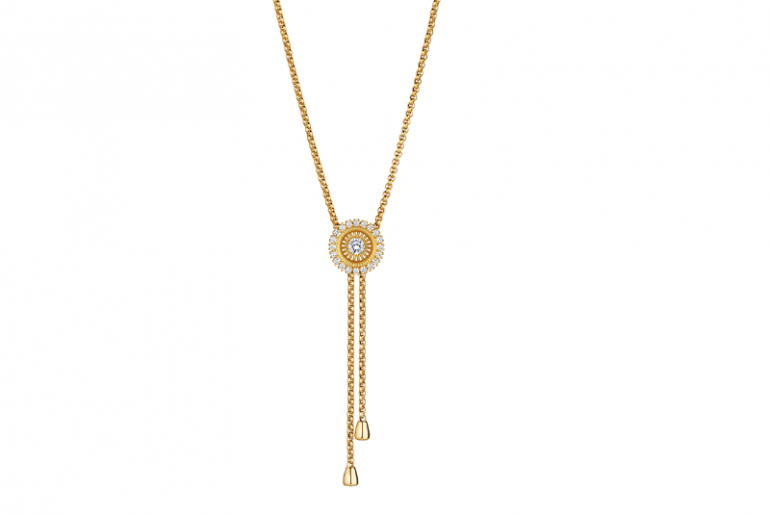 Jörg Heinz: Y-Collier „Swing I“ aus 750 Gelbgold, weißen Brillanten und einem beweglichen Diamant. Kettenlänge 70 cm. Ca. 3400 Euro