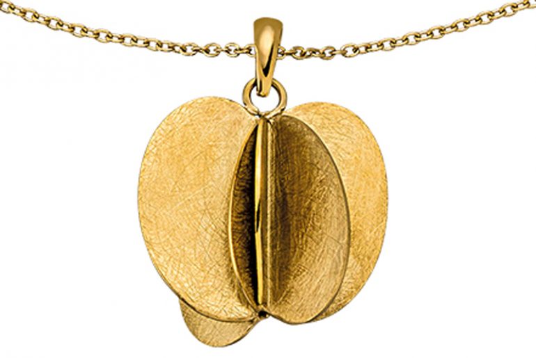 „Frangipani“-Anhänger mit Kette aus Edelstahl (Länge 70 cm) aus der Schmucklinie „Pure Volume“ in vergoldetem Edelstahl, ca. 129 Euro. Der Anhänger ist auch in Edelstahl erhältlich, ca. 119 Euro.