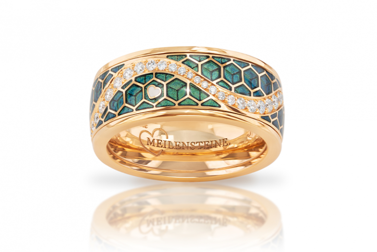 Durchbrochen wird diese faszinierende Farbenpracht lediglich durch ein geschwungenes Band aus über fünfzig von Hand gefassten Brillanten unterschiedlicher Größe, das den Rhythmus des Lebens abbildet und symbolisch für die besonderen wegweisenden Momente des Lebens steht. Optisch bildet die funkelnde Brillantlinie zudem einen edlen Kontrast zu den geheimnisvollen Grüntönen der Wellendorff-Kaltemaille und verleiht dem Ring aus 18-karätigem Gelbgold eine überaus strahlende Komponente. Ausgezeichnet mit dem Brillant-W, dem legendären Markenzeichen von Wellendorff und geschmückt mit dem charakteristischen Herzsymbol der berühmten Manufaktur, erweist sich der neue Jahresring „Meine Meilensteine“ damit im wahrsten Sinne des Wortes als magischer Wegbegleiter.