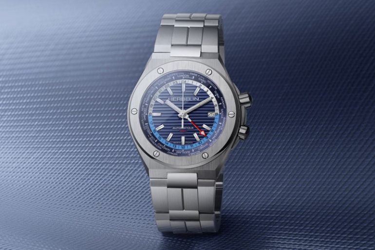 Für die charakteristische Eleganz von Michel Herbelin sorgt das silberfarbene Zifferblatt mit den markanten stahlbauen Totalisatoren. In dem 43 Millimeter großen Edelstahlgehäuse arbeitet ein Schweizer Quarzwerk von Ronda. Mit dem robusten Edelstahlband kostet der „Newport Chrono“ 799 Euro. Auf Wunsch ist das Modell auch mit einem cognacbraunen Lederarmband erhältlich.