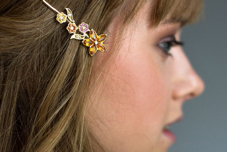 Eine, die zeigt wie extravagant und zeitgemäß Echtschmuck im Haar aussehen kann, ist Jennifer Althaus, die sich mit ihrem Label Jionova Hair Jewels einen Traum erfüllt hat. „Solitär-Ohrstecker bekam ich schon früh von meinem Vater geschenkt“, erzählt die 38-Jährige, die neben ihrem BWL-Studium eine Ausbildung zur Gemmologin in der Edelsteinhochburg Idar-Oberstein absolviert hat. „Aber für das Haar gab es nie etwas vergleichbar Feines und Schönes“, so Althaus.