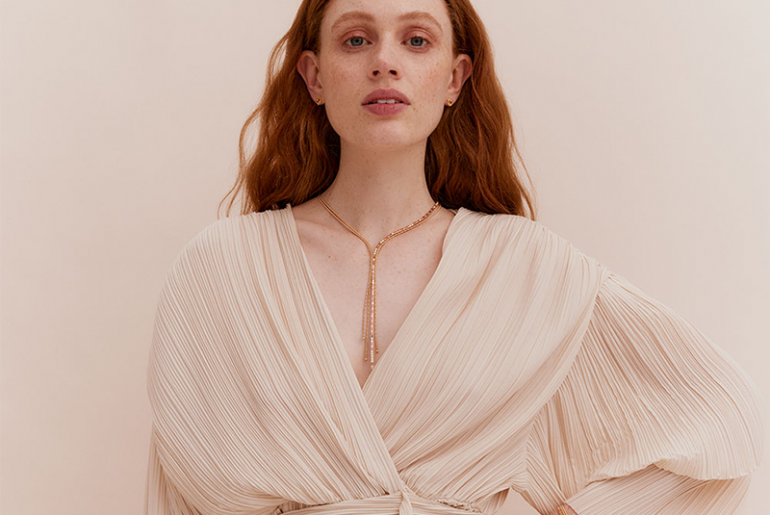 Wellendorff: Quiet Luxury und zarte Farbnuancen prägen die Kollektion „Mein Glück“ von Wellendorff. Model Laura Schuller trägt das Y-förmige Collier „Glücksverführung“ (ca. 48 500 Euro) und das Armband „Umarme mich. Mein Glück nude“ (ca. 29 600 Euro), beide limitiert auf das Jahr 2024. Dazu trägt Laura die Ohrringe „Seidenknoten“ (ca. 4100 Euro) aus 18 Karat Gelbgold und Brillanten. www.wellendorff.com