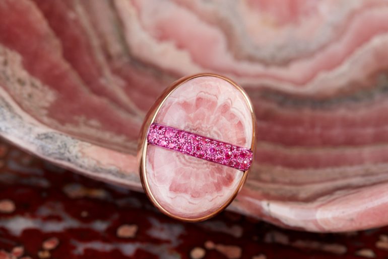 Das dritte große Thema der neuen „Armonie Minerali Collection“ ist der Versuch, die Energie und Lebendigkeit von Musik in die Welt des Schmucks zu übertragen. Von diesem künstlerischen Wagnis zeugen so faszinierende Preziosen wie der Ring „Adagio di Damasco“, dessen rosa-weiß-farbiger Rhodochrosit an die duftenden Blütenblätter einer edlen Rose erinnert. Das Band aus pinkfarbenen Rubinen unterstreicht diese betörende Wirkung nd erzeugt beim Betrachter eine geradezu hypnotische Wirkung.