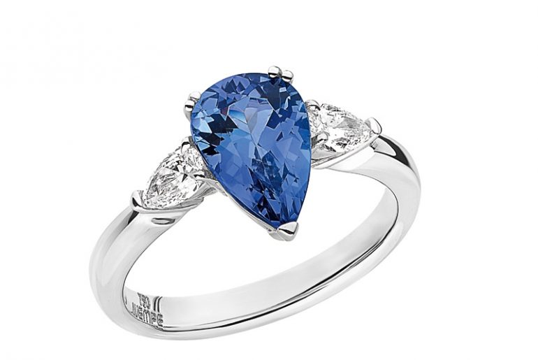 In der Trendfarbe des Jahres 2020: Der königlich anmutende Weißgoldring „One“ fasziniert mit einem blauen Tansanit-Tropfen, der von zwei prächtigen Diamant- Tropfen umrahmt wird. Von Wempe Classics; ca. 4975 Euro