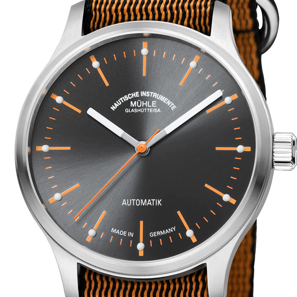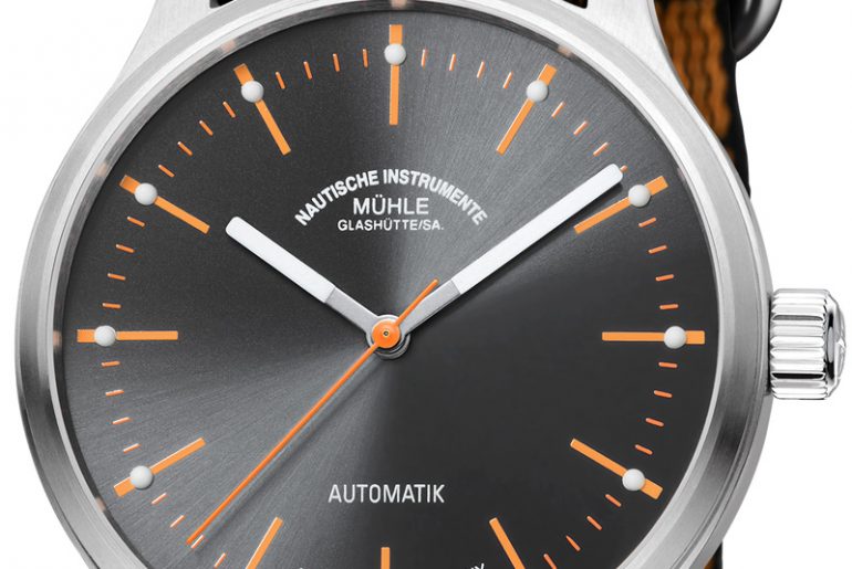 Das Familienunternehmen Mühle-Glashütte trägt den Titel „Nautische Instrumente“ im Markennamen und wird diesem durch die Einhaltung von „nautischen Tugenden“ vollauf gerecht: Denn die Uhren der sächsischen Marke erfüllen die Ansprüche nach Präzision, Robustheit und Ablesbarkeit. Diesen entspricht auch die jüngste Uhrenneuheit „Panova Grau“ auf sportlich-elegante Weise: Das schlichte Zifferblatt der Automatikuhr lebt durch den metallischen Glanz der Oberfläche im Kontrast zu den orangefarbenen Akzenten von Stundenmarkierungen und Sekundenzeiger. Das 40 Millimeter große Edelstahlgehäuse ist bis 10 bar wasserdicht und wird an einem orange-schwarzen Textilband oder einem Lederarmband getragen.