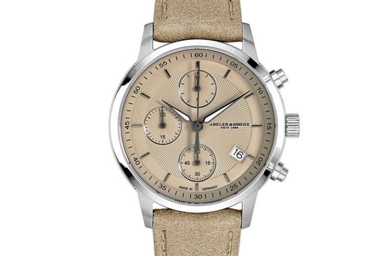 Der Chronograph von Abeler & Söhne gefällt mit seinem zeitlosen Design, der dezenten Beigenuance und dem anschmiegsamen Lederarmband.