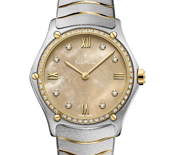 Diese Details bestimmen die moderne „Sport Classic Lady“, die vor drei Jahren neu aufgelegt wurde. Seitdem aktualisiert und erweitert Ebel die Linie stetig. Zu den Neuheiten dieses Jahres gehörten Modelle mit leicht vergrößertem Gehäusedurchmesser, was das Design noch frischer und moderner wirken lässt. Ebenfalls neu ist das Modell mit Zifferblatt aus gold- und beigefarben changierendem Perlmutt. Dieser Farbeffekt wird durch Diamanten auf der Lünette sowie als Stundenindizes auf dem Zifferblatt noch betont. Bei den Materialien setzt die neueste Version der „Sport Classic Lady“ von Ebel auf Bewährtes: Satinierter Edelstahl ist mit Gelbgold kombiniert – unter anderem sind die Kanten der Armbandglieder, die Krone und die Lünette samt Schrauben aus Gelbgold gefertigt. Preis auf Anfrage.