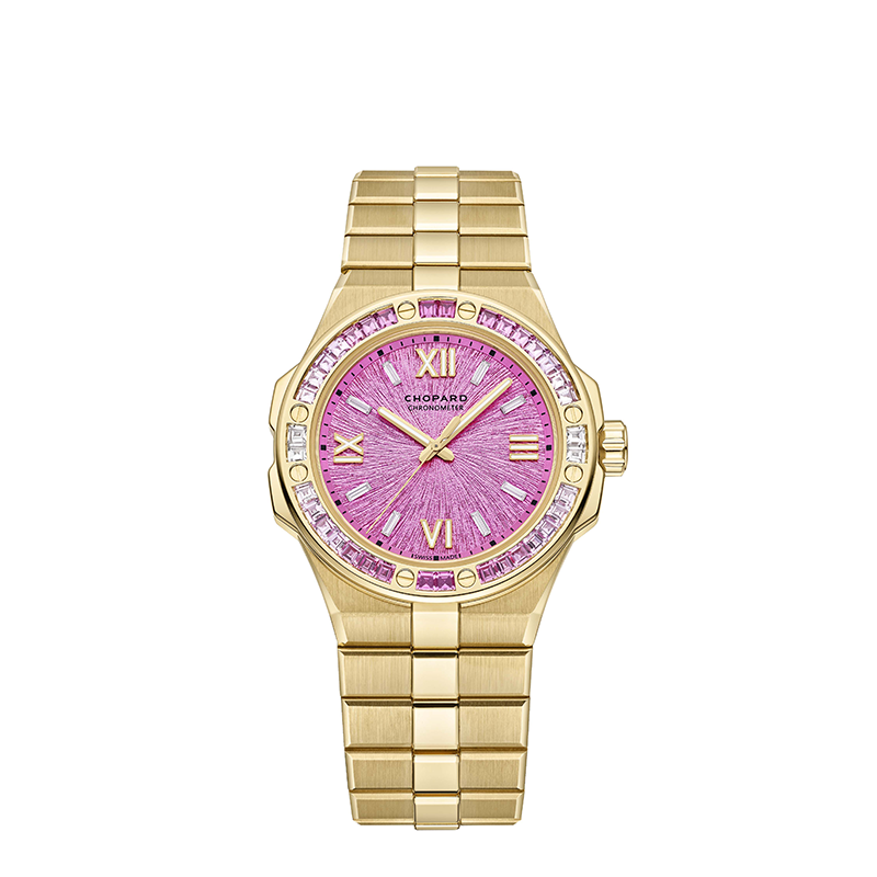 Rund um das Zifferblatt erstrahlt eine Lünette, besetzt mit pinkfarbenen Saphiren im Baguette-Schliff. Ihre Farbigkeit greift den Ton des Zifferblatts auf und lässt Gehäuse und Anzeige zu einer harmonischen Einheit verschmelzen. Diese präzise Edelsteinfassung zeigt, dass Chopard nicht nur die hohe Kunst der Uhrmacherei beherrscht, sondern ebenso die traditionsreiche Expertise in Steinauswahl und Edelsteinfassung pflegt.