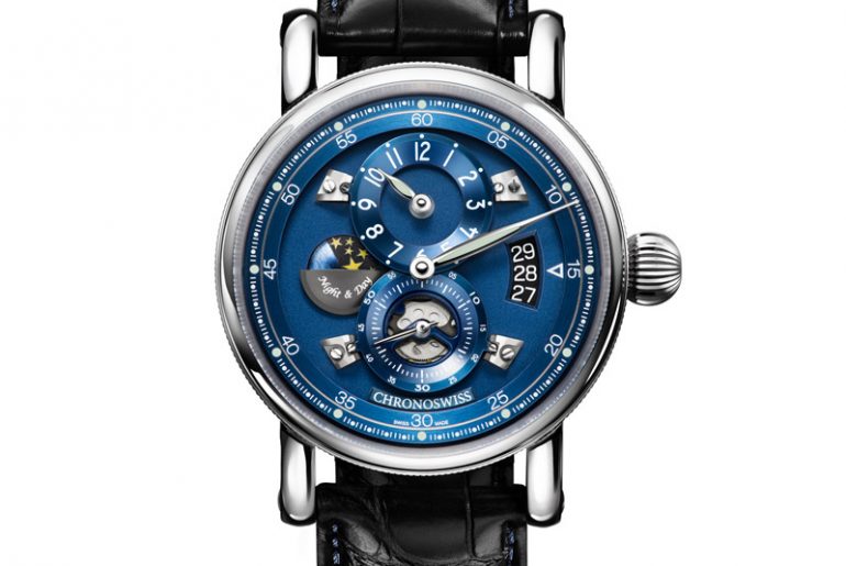 Gesteuert werden die verschiedenen Anzeigen rein mechanisch: Im Inneren des 41 Millimeter großen Edelstahlgehäuses arbeitet das Chronoswiss Automatikkaliber C.296. Dieses bietet 42 Stunden Gangreserve und ist mit einem skelettierten Rotor, polierten Schrauben und Zierschliffen ganz in der Tradition echter Uhrmacherkunst finissiert. Der „Flying Regulator Night and Day“ wird an einem handgenähten Louisiana-Alligatorlederband getragen und liegt bei ca. 6500 Euro.