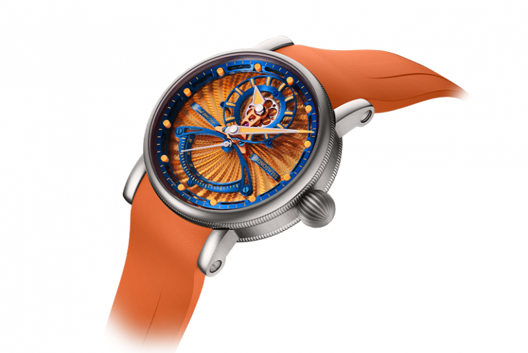 Die neue ReSec Helium Manufacture von Chronoswiss (Referenz CH-6923TM.1-ORBL) beeindruckt mit einem spektakulären Design, das die Blicke unweigerlich auf sich zieht. Dabei ist das feurige Orange des aufwendig gestalteten Guilloche-Zifferblatts von der Fusion im Kern der Sonne inspiriert, bei der Wasserstoff in Helium umgewandelt wird. Dementsprechend sind auf dem Zifferblatt auch die wirbelnden Sonneneruptionen nachgebildet. Einen eleganten Kontrast zu dem feurigen Auftritt bildet das 42-Millimeter-Gehäuse aus mattgrauem Titan. Limitiert auf nur 100 Exemplare wird die außergewöhnliche Uhrenneuheit von dem neuen Chronoswiss Manufakturkaliber C.6005 angetrieben und an einem sportiv anmutendem Kautschuk-Armband getragen.