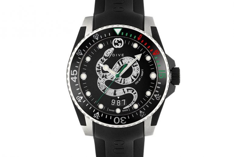Der kreativer Wagemut und der unkonventionelle Stil von Alessandro Michele hat schließlich auch die Uhrenkollektion von Gucci auf den Kopf gestellt. Unter seiner kreativen Leitung winden sich Schlangen über Armbänder und Zifferblätter, fauchen Tiger auf sonst eher klassischen Zeitmessern oder blicken Katzenköpfe hoheitsvoll auf den Betrachter hinab. Diese Motive beleben auch die neuen Dive-Uhren von Gucci. Der klassische Taucheruhren-Look der sportlichen Modelle mit bis zu 45 Millimetern Gehäusedurchmesser wird durch die Tiermotive konterkariert. Dazu zählt auch Alessandro Micheles persönliches Lieblingsmotiv: die Kingsnake. Diese schlängelt sich silberfarben über das Zifferblatt einer Uhrenneuheit. Der strenge Schwarz-Weiß-Look der Uhr wird dabei lediglich durch die farbigen Markierungen auf der einseitig drehbaren Taucheruhrenlünette aufgelockert. Das 45 Millimeter große Gehäuse ist aus Edelstahl gefertigt, birgt ein ETA-Quarzwerk und ist bis 200 Meter wasserdicht. Auf dem Gehäuseboden befindet sich das gravierte Gucci-Logo. Die Sportuhr wird an einem schwarzen Kautschukband getragen und kostet ca. 1150 Euro. Die kleinere Variante mit 40 Millimetern Gehäusedurchmesser wird ebenfalls für ca. 1150 Euro angeboten.