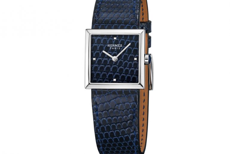 Die Faszination von echtem Leder: Hermès kleidet die neue „Carré Cuir“ in das Material, mit dem die Luxusmarke berühmt wurde. Zifferblatt und Armband scheinen direkt ineinander überzugehen – gefertigt aus nachtblauem Eidechsenleder.