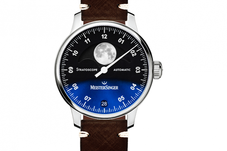 Die Einzeigeruhr wurde in den vergangenen zwei Jahrzehnten zu einem Markenzeichen von MeisterSinger und steht im Jubiläumsjahr erneut im Mittelpunkt. Zum Beispiel in der „Stratoscope“, einem der Jubiläumsmodelle. Auf dem Zifferblatt der Neuheit spielt der Mond eine besondere Rolle. Denn ihm ist die obere Hälfte des Zifferblatts gewidmet, auf der seine fotorealistische Darstellung einen großen Auftritt hat. Bei Nacht ist das besonders faszinierend, da er durch die Beschichtung mit Leuchtstoff illuminiert wird.